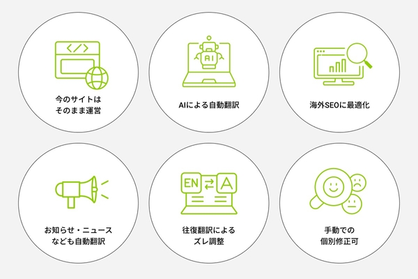 日本語サイトの内容をもとに、AIによる自動翻訳で多言語サイトを生成。短期間で6言語対応の外国人向け公式サイトを構築できます。