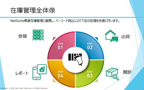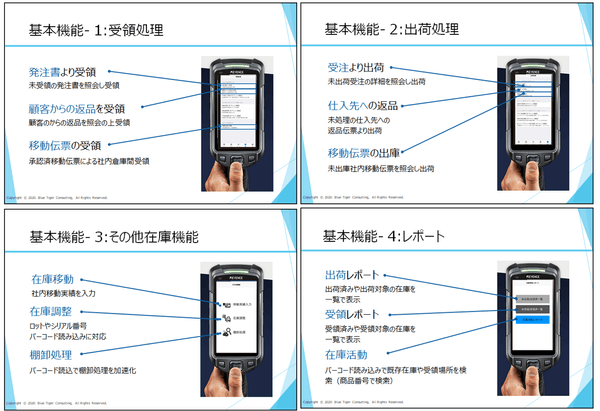 Blue Tiger Consultingでは、ハンディターミナルで取得した在庫データ(入手子データ)をWi-Fiなど無線接続によってクラウドERPのクラウドERPと常に連携しています。その基本機能は4つあります。