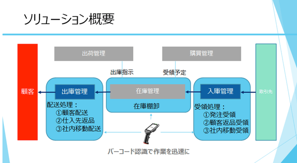 これまでの在庫管理オペレーションの問題点は、入出庫処理を紙ベースで行いそのデータをパソコンで入力するという作業の多重入力です。このやり方では、入出庫の際にメモを取るというオペレーションと、そのメモをパソコンで入力するオペレーションが生じます。ハンディターミナルを使うことで、この2度の入力オペレーションを1回で済ませることが出来るうえに、転記の入力ミスを無くすことが出来ます。入出庫オペレーションにおける在庫棚卸が、ハンディターミナルのバーコード認識によって迅速に処理出来ます。さらにハンディターミナルで取得した入出庫データは、クラウドERP(基幹システム)の標準在庫管理と連携することで常に最新の在庫状況を把握することが可能となります。これまでのシステムでは,ハンディターミナルを利用していてもその集計データをCSVファイルなどで一旦出力して、これをバッチ処理して基幹システム(ERPや在庫管理システムなど)に取り込む処理が必要でした。ハンディターミナルで取得した入出庫データを、クラウドERPと連携することで完全自動化処理することが可能となります。