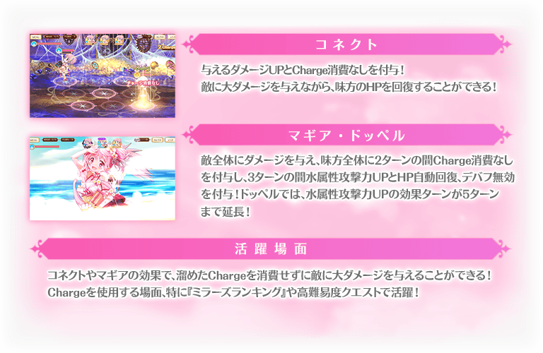 『期間限定 鹿目まどか 水着ver. ピックアップガチャ』では、下記ピックアップ対象の魔法少女およびメモリアの提供割合がアップしております。