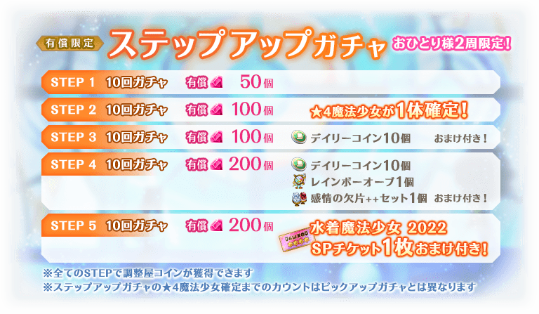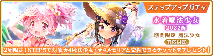 また、本ガチャの開催と合わせて『有償限定 ステップアップガチャ 水着魔法少女2022編』を開始いたしました。