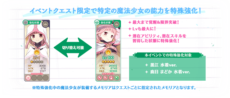 本イベントではイベント開催毎に、特定の魔法少女のステータスがUPしたり、編成に制限が生じるなどの特殊ルールが設定されます。