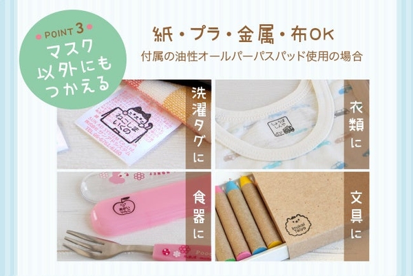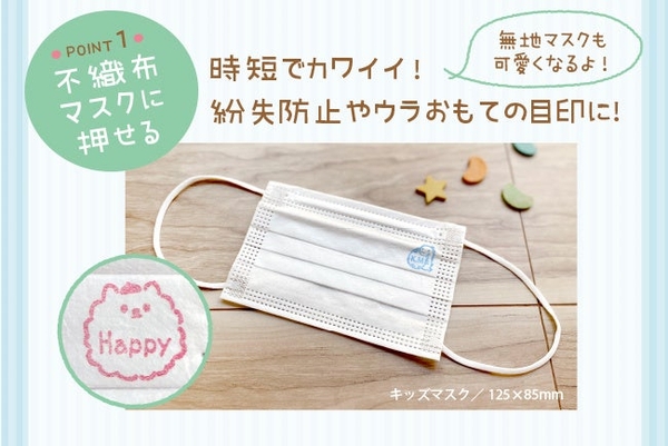 オリジナルのイラストにお好きな文字が入れられる、インク台つきの「マスクスタンプ」です。保育園・幼稚園で使うお子さまのマスクへの名前つけはもちろん、花粉症などで人目が気になる大人の方にもお使い頂けます。