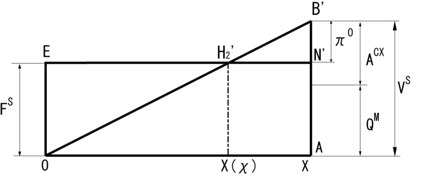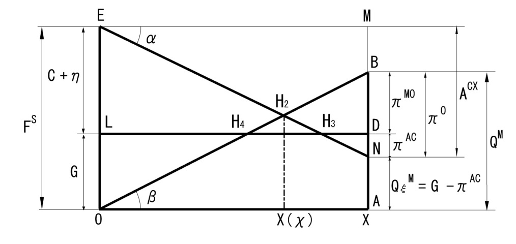 直接原価計算利益図(限界利益図)は、図1において、η=0、即ちA<CX>(-) = A<CY>(+)、及びA<CX> = 0とすれば得られ、F<D> = C + Gは水平線として描かれています。従って、図1と図2は完全に等価図形なのであり、両図共、直接原価計算利益図を含んでいます。