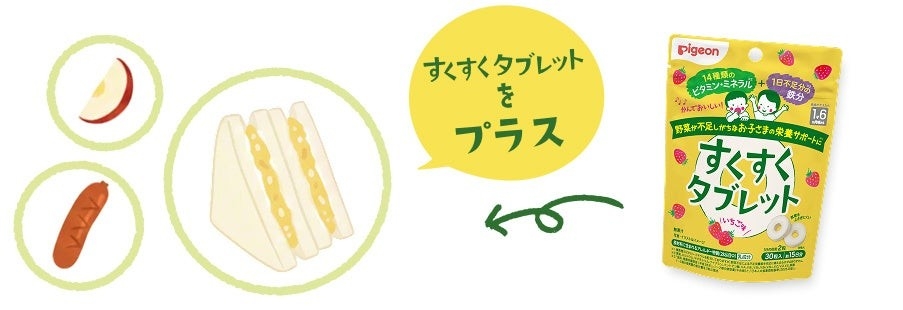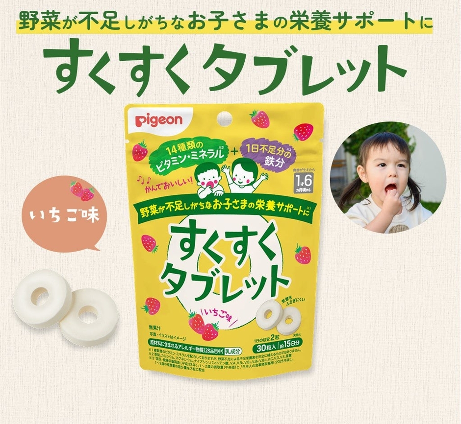 今回発売する「すくすくタブレット いちご味」は、1日2粒(目安)で14種類のビタミン・ミネラル(※2)が摂取でき、野菜が不足しがちなお子さまの栄養をサポート(※1)します。また、「1日不足分の鉄分」(※3)も併せて摂取できます。お子さまに人気のいちご味で、タブレット形状なので、家でも外出先でも場所を選ばずさっと食べられ、おやつや食後のご褒美として、いつでも、どこでも、美味しく、楽しく召し上がっていただけます.