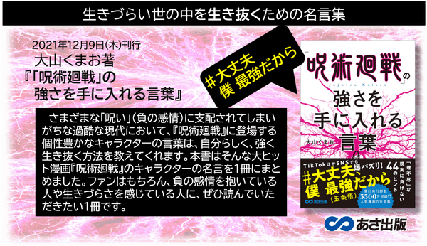 株式会社あさ出版(代表取締役:佐藤和夫、所在地:東京都豊島区)は大山くまお 著『「呪術廻戦」の強さを手に入れる言葉』を2021年12月9日(木)に刊行いたします。