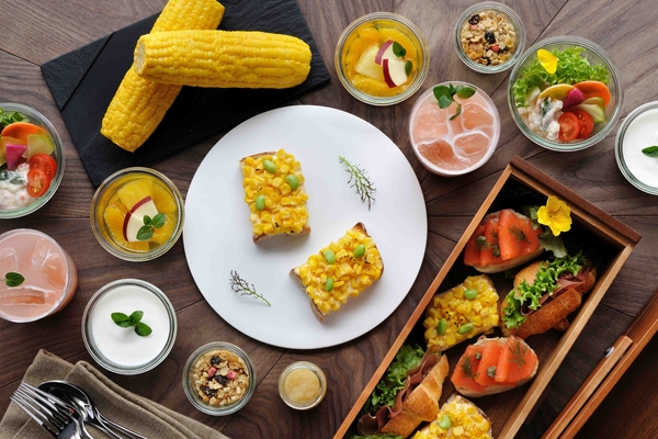 奥入瀬渓流が最も光輝く朝に、渓流沿いのテラスで夏の恵みを味わえる朝食です。クロワッサンサンドや、キッシュなど、彩り鮮やかな料理を詰め込んだ洋食セットに、季節の一品として、夏の食材を取り入れたとうもろこしのトーストを提供します。シャキッとした食感のとうもろこしの上に、卵黄とチーズをブレンドしたソースをかけ、味と食感の変化が楽しめる一品です。また、食事とともに季節のおすすめワインや季節のフルーツを使用したジュースも提供します。旬の食材を存分に味わいながら、せせらぎが優しく鳴り響く空間で、優雅な朝のひとときを過ごせます。