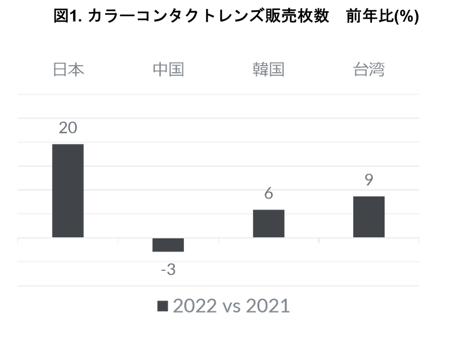 ・2022年のカラーコンタクトレンズ市場は、日本、韓国、台湾で前年を上回った。