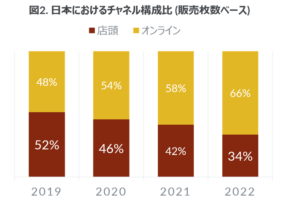 日本のチャネル動向を見てみると、オンラインが販売を市場を牽引している状況にある。販売チャネル構成比は、2019年に店頭とオンラインがほぼ同率であった。しかし店頭販売は減少が続き、オンラインが増加を続けたことで、2022年にオンラインが70%近くとなり、約20ポイントも拡大した。中国でもオンラインの好調さが目立ち、店頭での購入は縮小が進んでいる。
