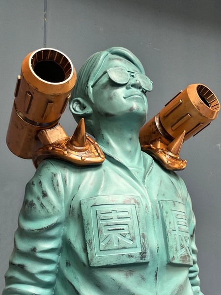 超ひらパー兄さん就任10周年を称え、2023年4月29日(土・祝)に建立された岡田園長像。7月15日(土)からは夏バージョンとして、あの懐かしい装いで、みなさまをお迎えいたします。拝むもよし、いろんな角度から眺めるもよし、記念写真を撮るもよし。思い思いに10周年を称えてください。