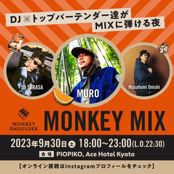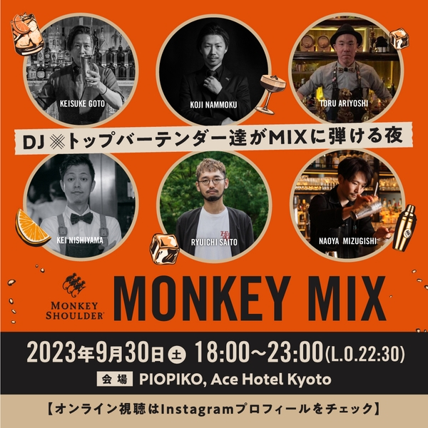 『100% MALT WHISKY MADE FOR MIXING』がコンセプトのモンキーショルダー(製造:スコットランド産、ウィリアム・グラント&サンズ社(本社英国) / 販売元 三陽物産株式会社(本社大阪)は、9月30日(土)18時から、エースホテル京都 2 階にある PIOPIKO バー&タコスラウンジにて、DJ の音楽とトップバーテンダーのカクテルが響き合うライブイベント『MONKEY MIX』イベントを開催します。