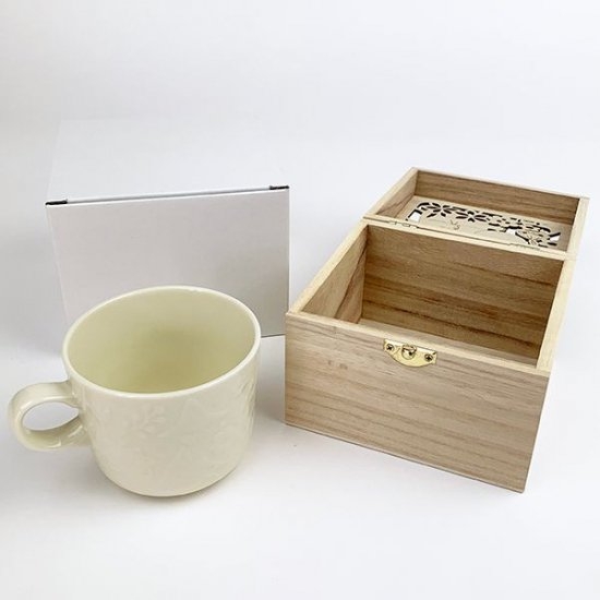 マグカップのかわいさは言うまでもありませんが、この木箱もインテリアになりそうなクオリティ♪透かし彫りが精巧で、このまま飾りたくなりますね。