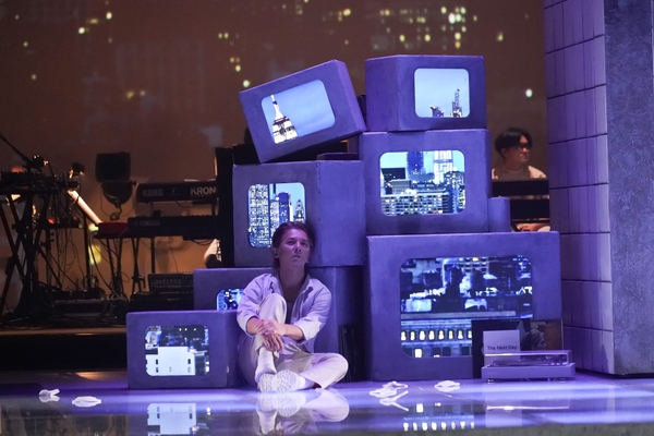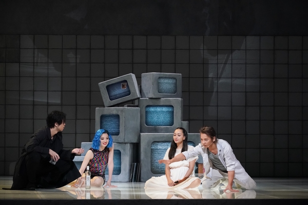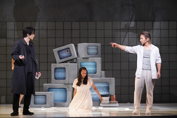 ステージ中央や前方には複数のテレビモニターが積まれているほかは、簡易ベッド、ルームライトと椅子、そして冷蔵庫と洗面台がある、シンプルな舞台装置。だがさまざまな映像がモニターだけでなく背景や、紗幕にもふんだんに映し出され、場面転換もリアルな部屋から広大な異空間まで、自在に行われていく。