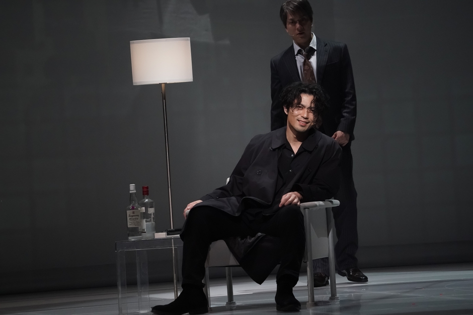 この作品はボウイ主演の映画『地球に落ちて来た男』をベースにしているのだが、その映画の内容を“これまでのあらすじ”的に紹介、主人公の<ニュートン>は異星人であること、だが自分の星に帰れなくなってしまうという映画での物語の続きが、この舞台で描かれていく。とある部屋に軟禁状態となっている<ニュートン>は酒浸りで、朝からジンを飲み朦朧とした表情でいるところに、昔の同僚だという<マイケル>が訪ねて来るところから物語はスタートする。ボウイがこの舞台のために書き下ろした楽曲『LAZARUS』を、前方に少し張り出したステージから乗り出すようにして歌う松岡。その姿はまさに“魂の叫び”を体現しているようで、幕開けから凄まじい迫力を放出していた。