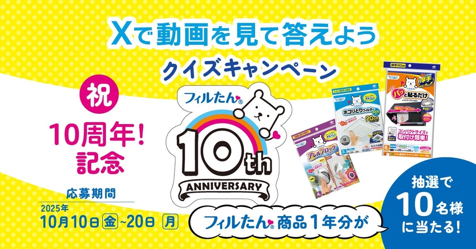 東洋アルミエコープロダクツ株式会社(本社:大阪市)は、フィルターブランド「フィルたん®」の誕生10周年を記念し、第3弾キャンペーンとして、2025年10月10日(金)から10月20日(月)までの期間、X(旧Twitter)にて「動画を見て答えよう!Xキャンペーン」を開催しております。