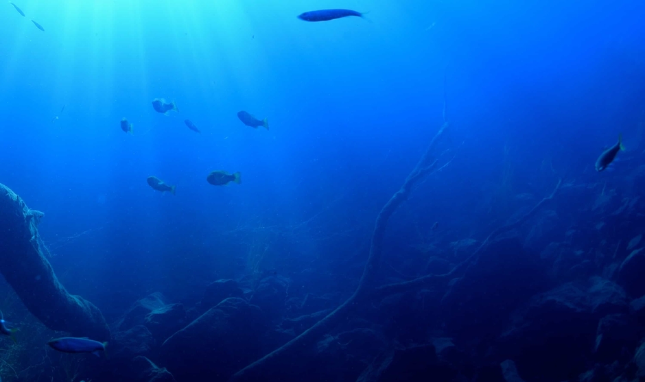 本栖湖は、日本有数の淡水ダイビングの名所です。動力船の乗り入れが規制されており、湖に流れ込む川がなく、湧水の湖で透明度が高いのが特徴です。見どころは、貞観(じょうがん)大噴火の時に、富士山溶岩が流れ込んだ溶岩地帯。溶岩のくぼみには、スジエビやギギが生息しています。また、湖底に静かに横たわる10m以上の大木や冷水が湧き出る大小の穴が点在するポイントなど、海にはない神秘的な景色を楽しめます。
