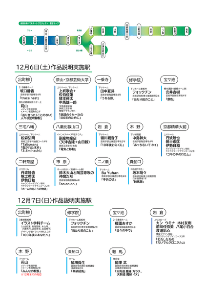 その一環として、2025年10月25日(土)~12月7日(日)に「未来のえいでん」アートプロジェクトと題し、叡山電車のホームや待合室、看板枠などを舞台に両大学の学生や教員が作品を発表していますが、最後の週末となる12月6日(土)と7日(日)に本プロジェクトに参加した両大学の学生が制作した作品について、自ら現地で直接説明する「『未来のえいでん』特別鑑賞DAY」を開催します。