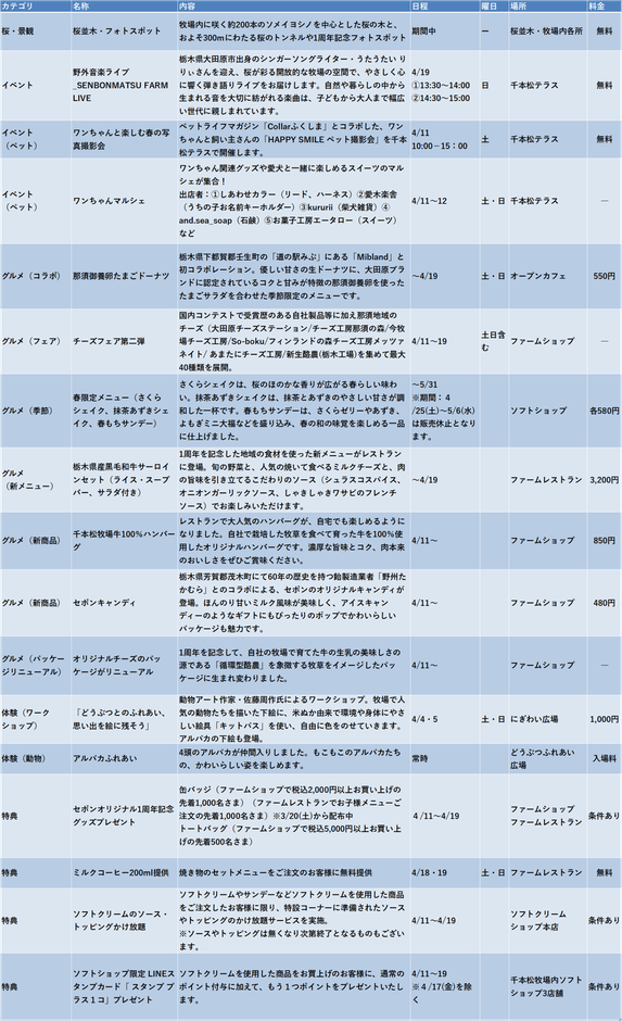 ・主な内容:桜の景観演出、1周年記念フォトスポット、新商品発売、地域連携の食企画、春限定メニュー、栃木県出身アーティストの野外音楽ライブ(無料)、どうぶつふれあい広場にアルパカ仲間入り、ペットと飼い主さまの写真撮影会(無料)、どうぶつアートなどの参加型イベント