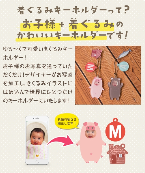 お子様の「顔写真」と「きぐるみデザイン」を組み合わせた、世界に一つだけのオリジナルグッズ「きぐるみキーホルダー」