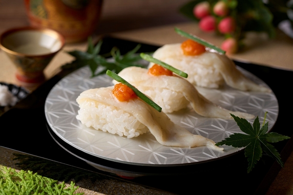 さらに、冬に脂が乗って旬を迎えるふぐとぶりもご堪能いただけます。繊細な旨みのふぐ握り寿司やふぐ煮凝り、香ばしいぶりの炙り握り寿司やお造りをご用意。ほっこりとした味わいのぶり大根もございます。海の幸をふんだんに使い、さまざまな調理法で仕上げた豪華な冬の味覚をご満喫ください。