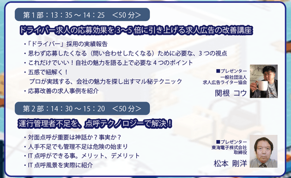 点呼機器およびアルコール検知器を開発・販売する東海電子株式会社(本社:静岡県富士市 代表取締役:杉本 哲也)は、 この度、 タクシー支援サービス株式会社(本社:静岡県静岡市 代表取締役社長:内田 和好 URL:https://www.taxi-ss.jp/)とタッグを組んで「超・人手不足!物流業界救う手法とは?」(無料)を11月29日(月)に開催いたします。