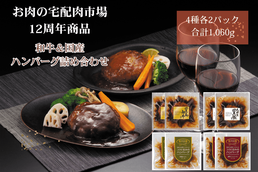 お肉の宅配肉市場12周年記念商品「国産ハンバーグ詰め合わせセット」12周年を記念したお得な特別セットです。