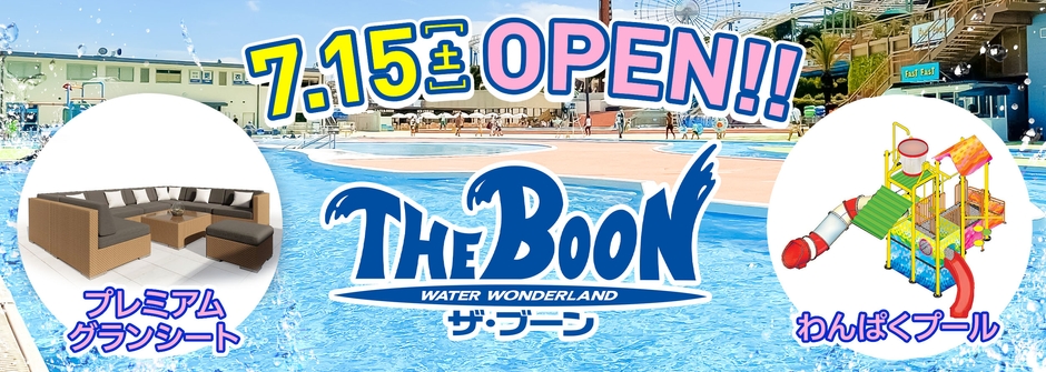 毎年好評の有料レストスペースは、今年新たなシートが登場します。また、「わんぱくプール」をリニューアルします。2種類のすべり台や水が降り注ぐ巨大バケツなどの遊具が増え、お子さまに楽しんでいただけること間違いなしです。楽しく、快適にお過ごしいただける「ザ・ブーン」にぜひお越しください。