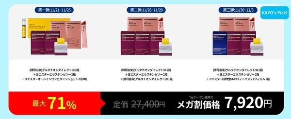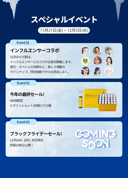 このたび2025年11月21日(金)から12月3日(水)まで開催されるQoo10メガ割では過去最大数のインフルエンサーとのコラボ企画を開催します。スペシャルなラインナップに加えて、特典付きイベントなど年末のメガ割にふさわしい構成となっております。さらに、500個限定でビタミンショット(30個入り)をセール価格でご提供、11月28日~30日はブラックフライデーセールを開催いたします。他にも、スペシャルイベントで楽しさ満載のメガ割で楽しく健康に、そしてお得にお試ししてみてください!