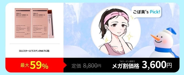 ごぼ美さんがおすすめするエラスチンDNAゼリーがメガ割特価で登場!2箱セットが1箱の値段よりも安い59%OFF。こだわりのエラスチン成分を配合したセットで、うるツヤ×ハリ感を実感し、エラスチンの働きでしなやかな肌印象を演出してハリツヤをアップ。内側から輝くようなハリ肌ケアを実現し、持ち運びに便利で簡単に摂取できるため外出先や忙しい日常にも手軽に取り入れられます。この機会をどうぞお見逃しなく。