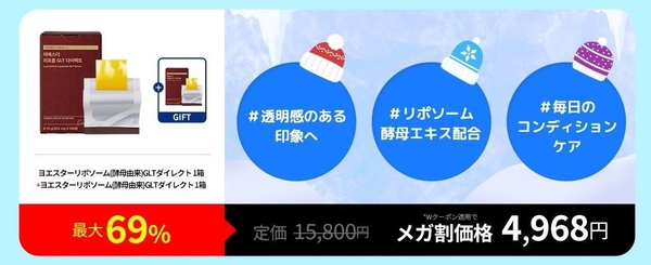 エスターフォーミュラの人気商品「(酵母由来)ヨエスターリポソームGLTダイレクトウルトラX」は、グルタチオン(酵素エキス)を中心に、ビタミンC・ビタミンE・ミルクシスルを贅沢にブレンドしたフィルム状サプリです。口腔内で溶ける設計のおかげで吸収を高め、肌のくすみを薄めて明るさを引き出すトーンアップをサポートします。エイジングケアと肌の美白ケアを両立したい方に最適で、コンパクトなサイズなので外出先でも手軽に取り入れられます。毎日の美肌ケアをしっかりサポートします。メガ割限定キャンペーンとして、1個購入で追加1個を無料プレゼント中です。お得なこの機会をぜひお見逃しなく。