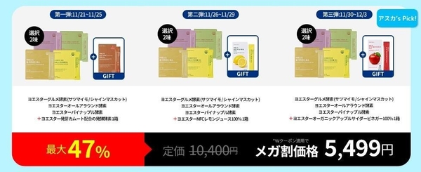 【第一弾(11/2111/25)】+ヨエスター発芽カムート配合の発酵酵素 1箱11/29)】+ヨエスターNFCレモンジュース100% 1箱