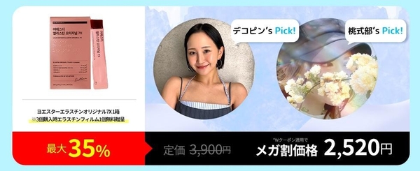 デコピンさんと桃式部さんのおすすめ「エラスチンオリジナル7X」は、肌の弾力とハリを高めるコラーゲン・ヒアルロン酸・エラスチンを豊富に含むエラスチンゼリーです。エラスチンは肌の弾力を維持し、真皮のコラーゲンをしっかりサポートする重要な成分。今回の配合では、魚由来エラスチンより高いデスモシン含有量を誇る「馬エラスチン」を採用。特に若々しさの維持やラインケアを重視する方に適しています。日々のスキンケアに取り入れることで、弾むような若々しさと艶やかな肌を目指せます。さらに、メガ割限定のキャンペーンとして、3個ご購入でエラスチンフィルムを1個無料でプレゼントする特典を実施中です。お得なこの機会を、ぜひお見逃しなく。