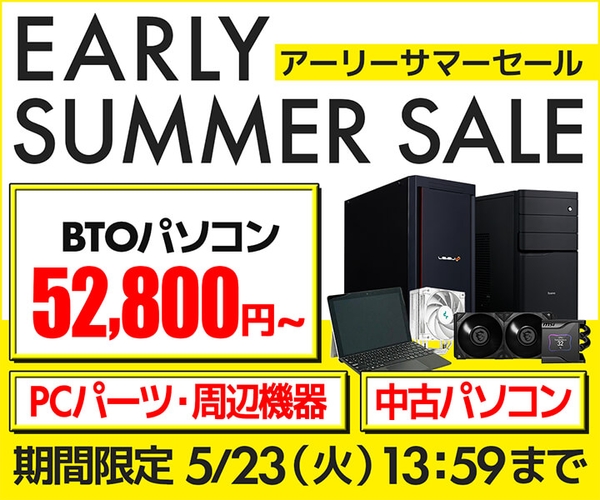 パソコン工房・グッドウィルを運営する株式会社ユニットコム(代表取締役:端田 泰三、本社:大阪市浪速区)は、パソコン工房WEBサイトにて、『アーリーサマーセール』を2023年5月9日(火)18時30分~2023年5月23日(火)13時59分までの期間限定で開催中です。