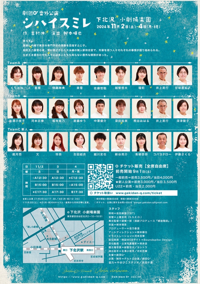 劇団Q+(主宰:柳本順也)主催、劇団Q+番外公演 vol.02『シハイスミレ』が2024年11月2日 (土) 〜 2024年11月4日 (月・祝)に下北沢 小劇場楽園(東京都 世田谷区 北沢 2-10-18 B2)にて上演されます。