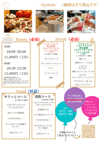 2名様〜最大20名様まで!1組限定!ご家族や仲間だけで集まる安心・安全な空間でお料理・お飲み物をご提供します。イベント会場や女子会、パーティー会場に最適です。部屋代金均一。