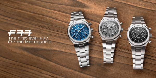 今回登場する「F77 ChronoMecaquartz」は、シリーズとしては初のメカクォーツ・クロノグラフであり、既存モデルの復刻ではなく、完全な新コレクション。F77が築いてきたデザインコードを継承しながら、よりアクティブで現代的な使い勝手を備えたタイムピースに仕上げた。F77を象徴する“ウーブン(編み込み)パターン”を採用したブルーダイヤルとグレーダイヤル、そしてテクニカルな雰囲気を持つカーボンパターンのダイヤルを備えた、合計3品番がラインナップ。ブルーは光の角度によって表情が変化し、スポーティな清涼感を演出。グレーは落ち着いたモノトーンの中にF77らしいテクスチャーの深みが際立ち、よりシックで汎用性の高い印象に仕上がっている。カーボンダイヤルは最もモダンでアグレッシブな印象で、シリーズに新たな個性をもたらしている。