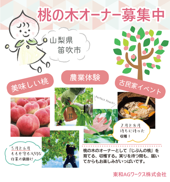 東和AGワークス株式会社(本社:山梨県笛吹市、代表取締役社長:稲葉登一、以下「東和AGワークス」は、自社が管理・運営を行っている山梨県笛吹市の桃農園を中心に展開する「桃の木オーナー制度」を立ち上げ、2024年3月27日(水)からオーナー申込受付を開始しました。