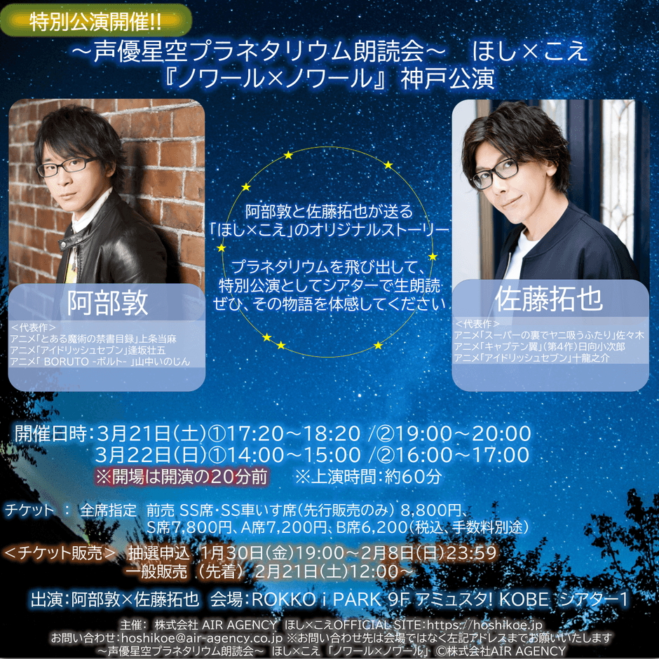 阿部敦、佐藤拓也出演 ほし×こえ 【神戸公演】 2月21日(土) 12:00~チケット発売開始!