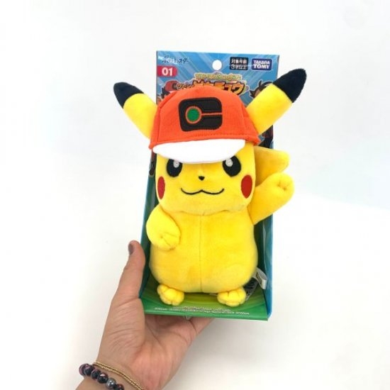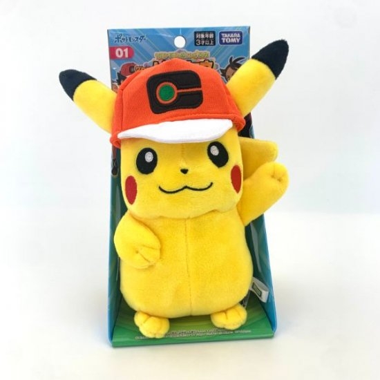 まずはサトシのピカチュウから。アニメポケットモンスターに登場する主人公、サトシの相棒的存在のピカチュウです。ほかのピカチュウとは違いサトシの帽子を身に着けています。このぬいぐるみの帽子は取り外しが可能◎