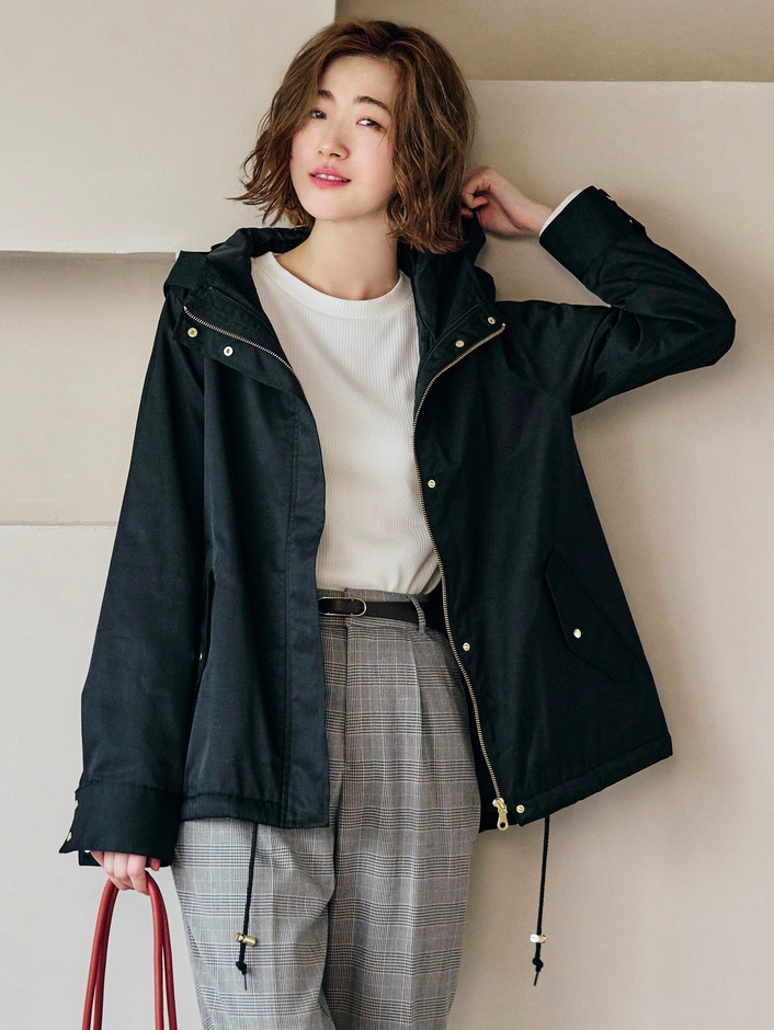 裾をドロストで絞ると丸みのあるシルエットに変化し、着丈を微妙に調整できるのでスタイリングに合わせたアレンジが可能です。