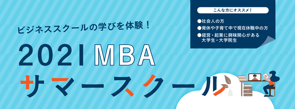 2021 MBAサマースクールは2021年8月7日(土)にオンラインで開催。「組織・人事管理」「経営戦略」「マーケティング」の3つの科目を無料で受講いただけます。それぞれの科目は入門編となり、社会人の方をはじめとし、育休や子育て中で現在休職中の方、経営・起業に興味関心がある大学生など幅広い方を対象としています。