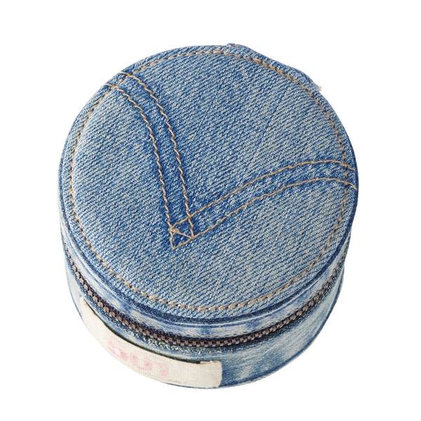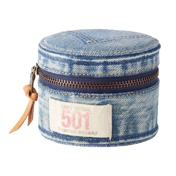 時計のデニムストラップ同様、ヤマサワプレスが所有するリーバイス® 501®の腰裏部分をボディに採用したマカロン型ウォッチケース。存在感のある501タグや、蓋のアーキュエットステッチなど、デニム好きを虜にするディティールです。