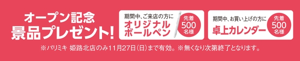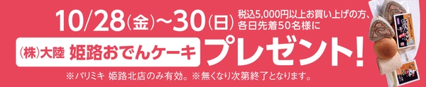 オープンを記念し10/28(金)~30(日)の3日間、税込5,000円以上お買い上げの方 各日先着50名様に、「姫路おでんケーキ」をプレゼント! 更に11/27(日)までの期間中、お買い上げの方 先着500名様に卓上カレンダーを、またご来店の方 先着500名様に、オリジナルボールペン をプレゼントいたします!
