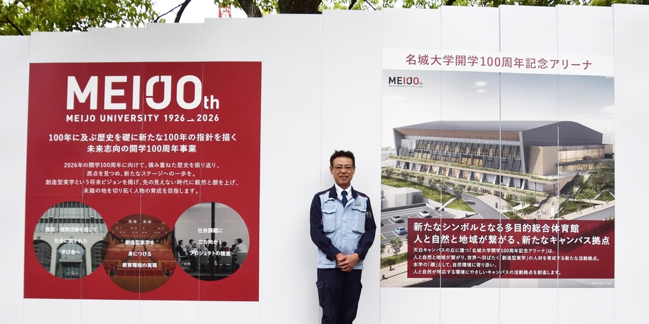 2026年に開学100周年を迎える名城大学。天白キャンパスでは、入学式、卒業式や大型イベント会場としても利用できる記念アリーナの建設が進められている。7月には巨大屋根も姿を見せる予定だ。2・3号館の解体跡地の建設現場で指揮を執るのは理工学部建築学科卒業生で、熊谷組名古屋支店統括所長の安達直樹さん(1990年卒)。2号館は安達さんが受験した入試会場でもあった。思い出が詰まったキャンパスで、母校の新たな100年の幕開けを告げるシンボルとなる巨大アリーナ建設に取り組む日々が続いている。