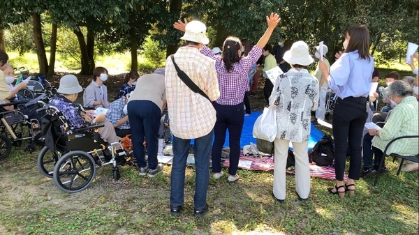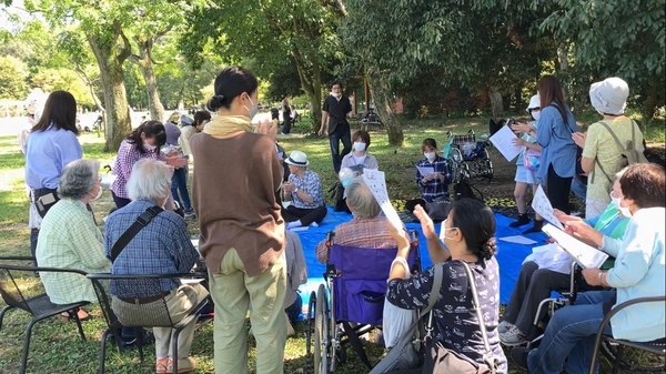 高齢者の車いすを大学生が押しながら植物を観賞したり、園内の広場では参加者全員で童謡『赤とんぼ』『虫の声』を歌ったりして、楽しい時間を過ごしました。