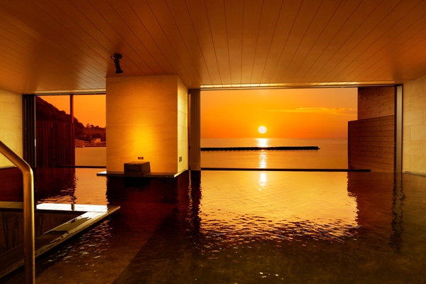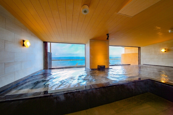 駿河湾を一望できる海の見える大浴場をご利用いただけます。夕刻になれば、黄金色に染まる景色を眺めながら温泉体験が可能です。(季節・天候・時間により景色は異なります)