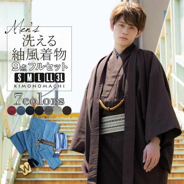 仕立て上がりの洗える袷着物と羽織のアンサンブルに、綿角帯・羽織紐・長襦袢・ソックス足袋・腰紐・雪駄がついたフルセットです。着物・羽織・襦袢は自宅で洗濯できるポリエステル素材。肌襦袢やランニングやTシャツ、ステテコなどインナーの肌着さえ用意すれば、すぐにお出かけできます。着物初心者にもおすすめの着物セットです。