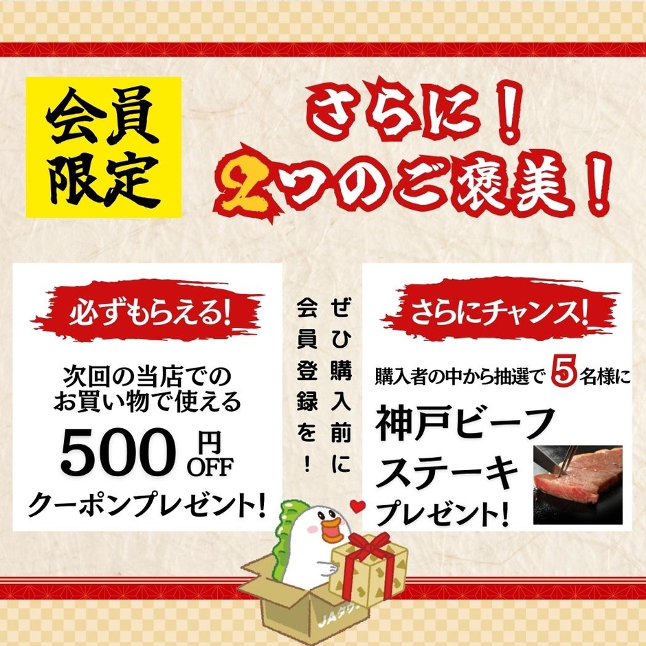 〇 キャンペーン① ご購入いただいたJAタウン会員様全員に、次回当ショップでのお買い物に使える500円分のクーポンをプレゼントいたします。2024年1月中旬にマイページに付与いたします。