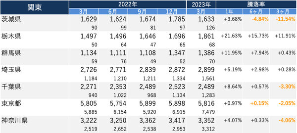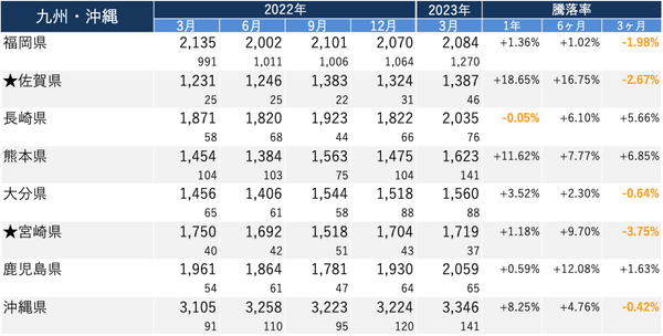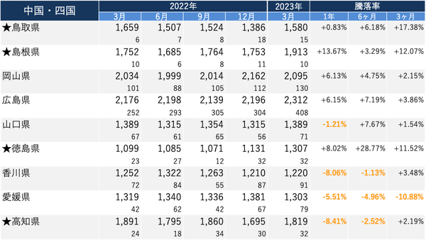・各エリアで、2023年3月の価格/1年前と比較した騰落率がトップの都道府県は以下の通り。