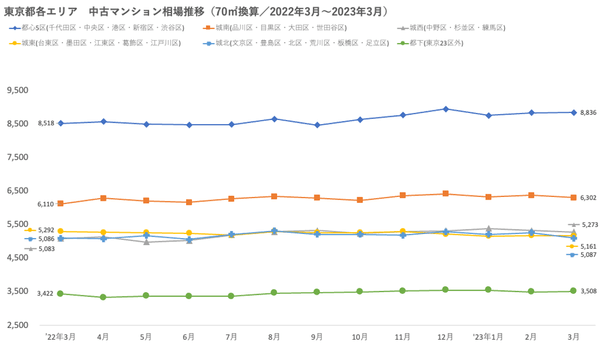 ・首都圏で推定価格がトップのエリアは「都心5区(千代田区・中央区・港区・新宿区・渋谷区)」で、2023年3月の推定価格は8,836万円。